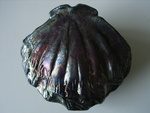 2008Vanuit een duimpotje opgebouwde schelpvorm met deksel. Biscuitbrand en raku gestookt.