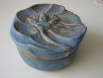 2008Een rond doosje, uit ringen opgebouwd. De deksel stelt een lotusbloem voor. Steengoedgazuur en goudluster.